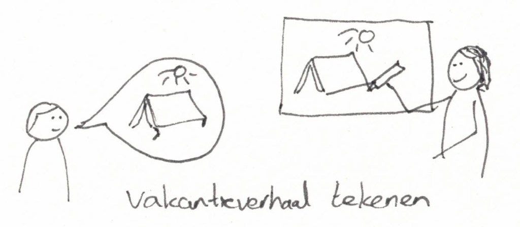 Afgelopen vakantie heb ik me verder verdiept in het ondersteunend tekenen. Ik heb de gratis videotraining van Pien van der Most gedaan en ik leende het boek Visueel werken van Willemien Brand uit de bibliotheek. Dit boek is niet specifiek gericht op het werken met kinderen, maar ik heb er wel leuke ideeën uit gehaald. Tot slot heb ik regelmatig in een schriftje getekend wat ik die dag had gedaan. Ik krijg er steeds meer lol in. Mijn tekeningen zijn nog steeds niet mooi, maar dat hoeft ook niet. Ze hoeven alleen te ondersteunen. Ik schrijf erbij wat het voorstelt, dat scheelt ook natuurlijk.
